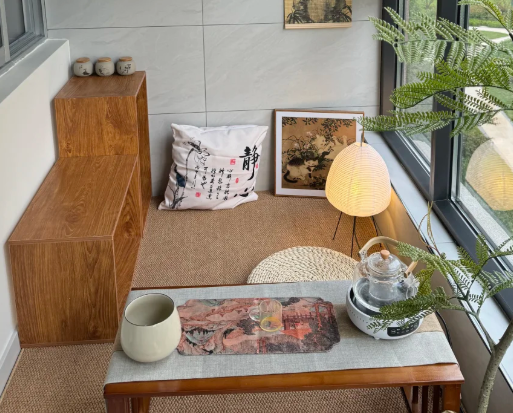 比如,有的家庭会在阳台中设计成了休闲区,在这里放上茶台、蒲团等等,平时跟朋友和家人一起坐在这里喝茶聊天是很开心的。